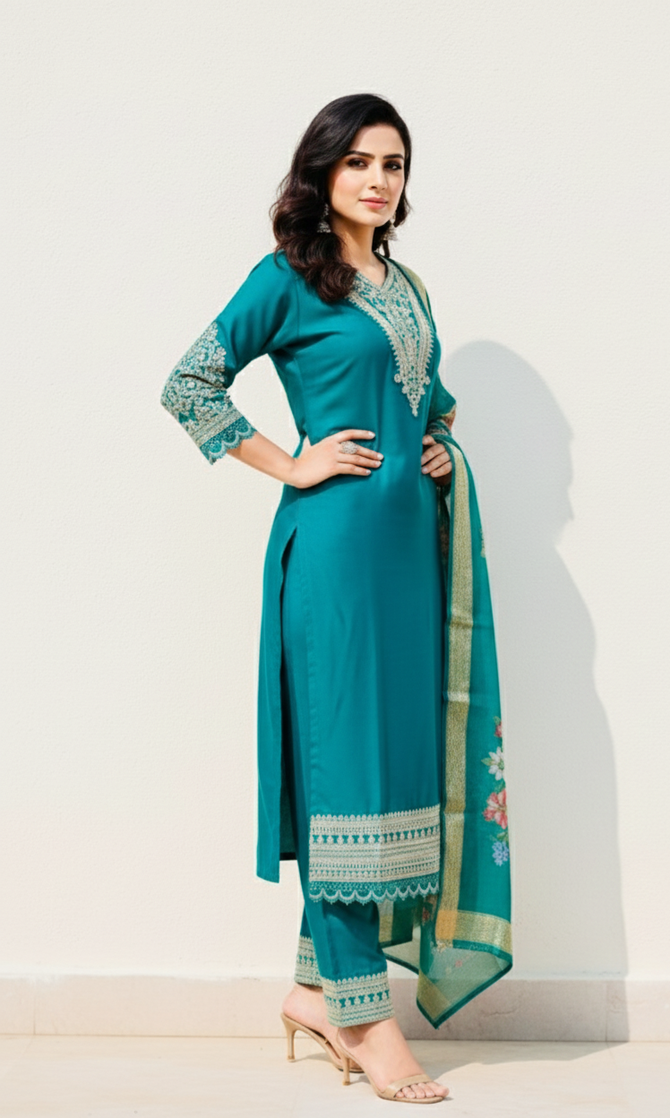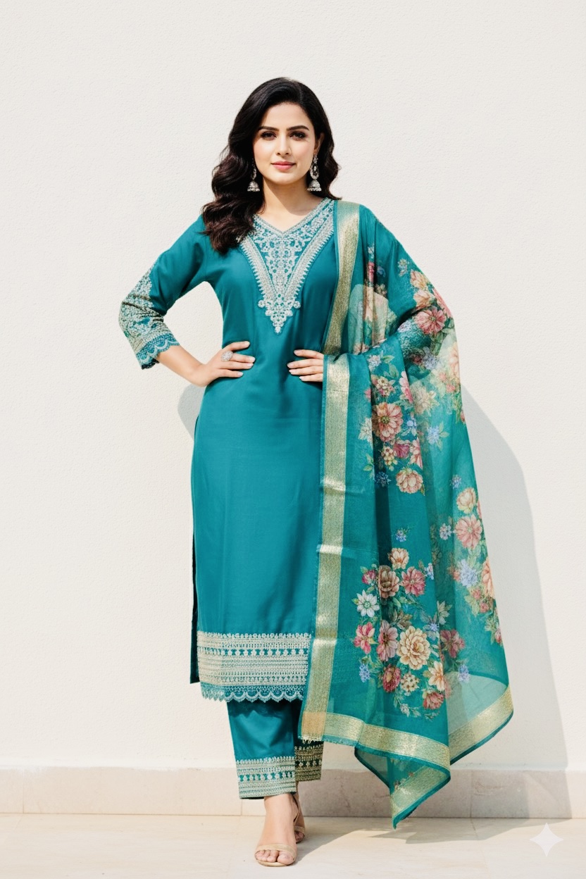 The kurti features a stylish V-neck design with intricate Aari work, adding a touch of traditional charm. Paired with matching cotton blend pants and a lightweight organza dupatta, this 3-piece set creates a graceful and coordinated look. The knee-length kurti and three-quarter sleeves ensure a flattering silhouette suitable for all body types.